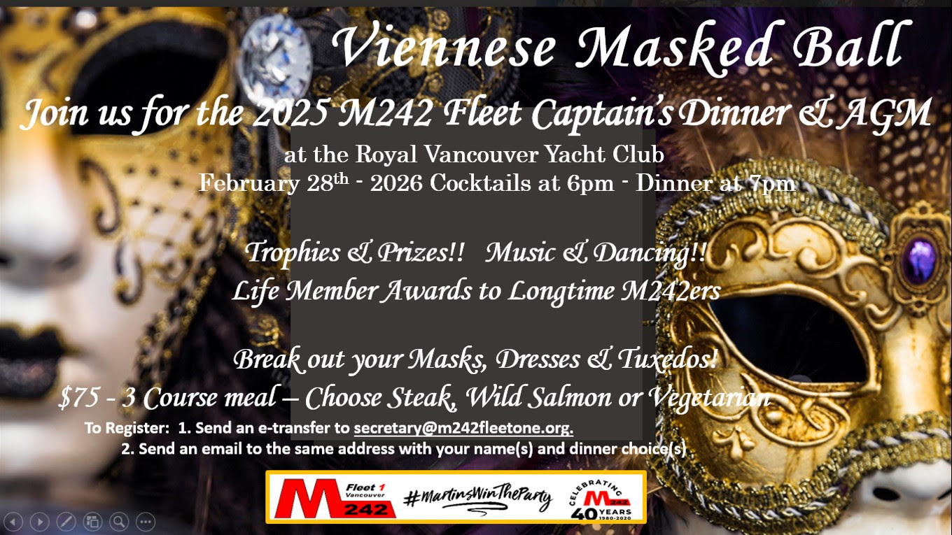 Please find below the invitation, registration, payment, and meal choice information re the upcoming M242 Fleet Captain Dinner (and a very very short AGM) at Royal Vancouver Yacht Club where in addition to awarding prizes to the winners of last year's events, we will also for the first time be recognizing 5 Life Members of M242 Fleet One for their major contributions to the Class going back to 1981.